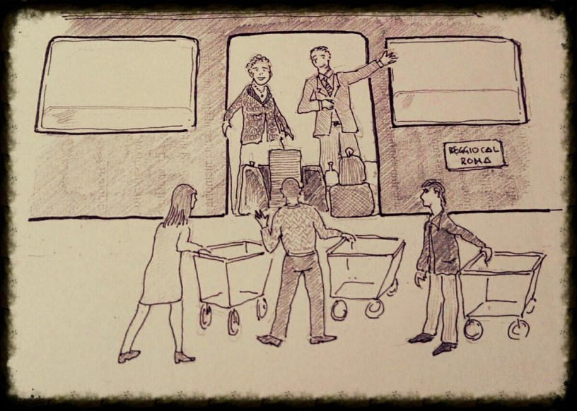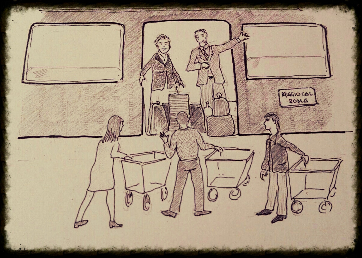 Alla partenza mia Madre mi telefonava per comunicarmi che erano partiti in orario e che mi avrebbe richiamata quando erano “all’altezza di Napoli”, per informarmi se c’era ritardo o meno.. la telefonata si chiudeva sempre alla stessa maniera: io le domandavo: “quanti bagagli hai portato?” e lei mi rispondeva: “Prendi due / tre carrelli…” Andavamo sempre a prenderla in due: mio fratello ed io, quando puoi mi fidanzai andavamo in tre; sembravamo i tre moschettieri “armati” ognuno di un carrello. Ci posizionavamo all’altezza della carrozza e aspettavamo che scendesse la gente per non intasare la discesa, la Mamma da sopra la carrozza già si sbracciava e sorrideva contenta, arrivato il momento dello scarico si contava: “1 2 3 4 5 6 -attento in quello ci sono le uova! – 7 8 9 10 e 11 ! ok ci sono tutti, possiamo andare!” e finalmente ci potevamo abbracciare e salutare con la serenità che tutti i pacchi erano arrivati a destinazione.