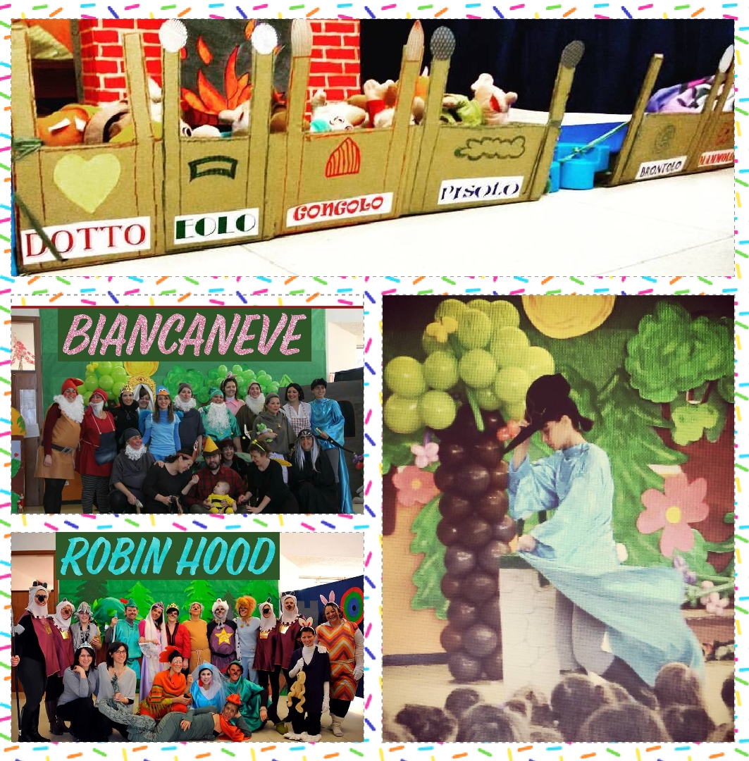 La storia del mio primo anno fu “Robin Hood”, io facevo il fratellino di uno dei coniglietti, avevo una sola battuta ed ero emozionatissima… ho curato l’abbigliamento, la battuta e una settimana prima della recita ho deciso, visto che ero il più piccolo dei coniglietti, di fare la scena in ginocchio creando dei piedi finti da attaccarmi alle ginocchia…può sembrare strano ma nel mio piccolo volevo far bella figura, volevo essere il più verosimile possibile anche per non rovinare la scena con tutti gli altri personaggi. Avendo solo una scena principale, dietro le quinte aiutavo nei cambi scena e le altre Mamme a ripetere, in nome della bellissima sensazione di far parte di un gruppo: tutte orientate (ognuna con il proprio carattere, con le proprie idee e convinzioni) al divertimento dei bambini che quando li vedì lì seduti davanti a te con gli occhioni sbarrati dalla meraviglia di una scenografia fatta nel migliore dei modi ma con materiali poveri e che ti guardano con attenzione per riconoscere la propria mamma e indicarla al compagno seduto accanto, vieni ricompensata dell’impegno e delle corse per arrivare puntuale alle prove tutte le settimane…