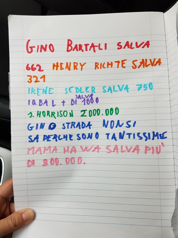 E allora ha iniziato a raccontare anche di altre persone importanti che hanno salvato tante vite, tra cui un altro Gino: Gino Bartali che di nascosto riuscì a salvare la vita a degli ebrei grazie alla sua bici (G.Bartali), e poi Henry “Richte” ( H.Ritchie), poi Irene “Sedler” un’infermiera che salvò la vita a molti bimbi ebrei (I.Sendler).
