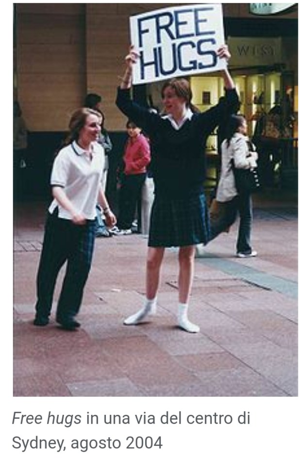 Tempo fa lessi di un’iniziativa in Australia chiamata “Free hugs” (abbracci gratis) in cui ci si poteva abbracciare senza doversi conoscere o senza dover palesare il perché di un momento particolarmente felice o triste… così sono andata a cercare su youtube e ho trovato questo video: “Free Hugs Campaign, Melbourne, Australia” in cui dopo la prima esitazione iniziale l’abbraccio diventa un gesto che genera sorrisi…non è poco.