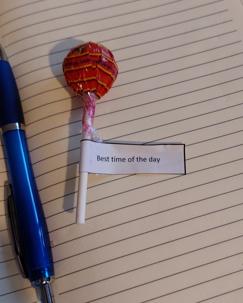 Stamattina, lasciate le ragazze a scuola subito a casa di una mamma del gruppo di conversation english e abbiamo passato 4 ore a chiacchierare e pianificare i prossimi topic che ci interessa approfondire..ognuno ha preso “al buio” un chupa chups a cui la teacher ha attaccato un bigliettino con una frase, in base alla scritta sorteggiata ognuno di noi durante il break di settimana prossima dobbiamo girare un breve video che racconta quello che è scritto su, quindi a me tocca fare un video sul momento migliore delle mie giornate.. ho già qualche idea ma devo mettere giù le idee e poi realizzare il video, chiederò aiuto alle mie ragazze così da coinvolgerle visto che saranno a casa da scuola.